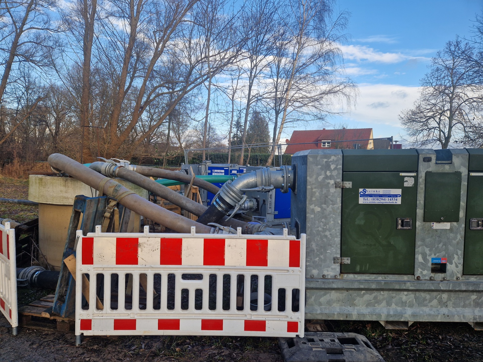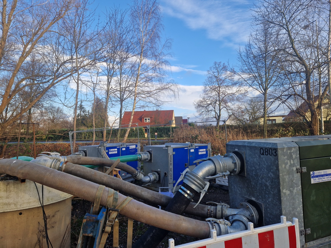 In den Sommermonaten neigt das stehende Wasser zur Verschlammung. Während der gesamten Bauzeit hatte die Sicherheit für den Auftraggeber, eine Kommunalbehörde in Ostdeutschland, höchste Priorität, um Unfälle zu jeder Zeit auszuschließen. Jegliche Störungen oder Fehlfunktionen hätten erhebliche Schäden und Kosten verursachen können. Alle Pumpen mussten jederzeit mit maximaler Leistung laufen, um das Gesamtvolumen von ca. 1200 m³/h über das 450 m lange Rohrsystem abzupumpen. Da kein natürlicher Zu- oder Abfluss vorhanden ist, drohte ein ökologischer Kollaps.